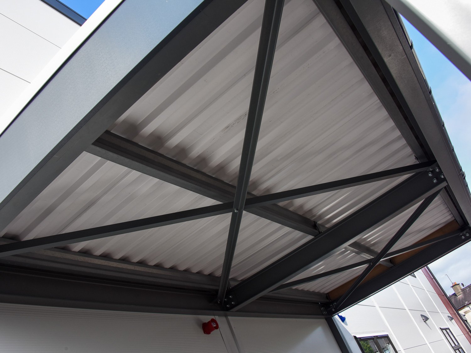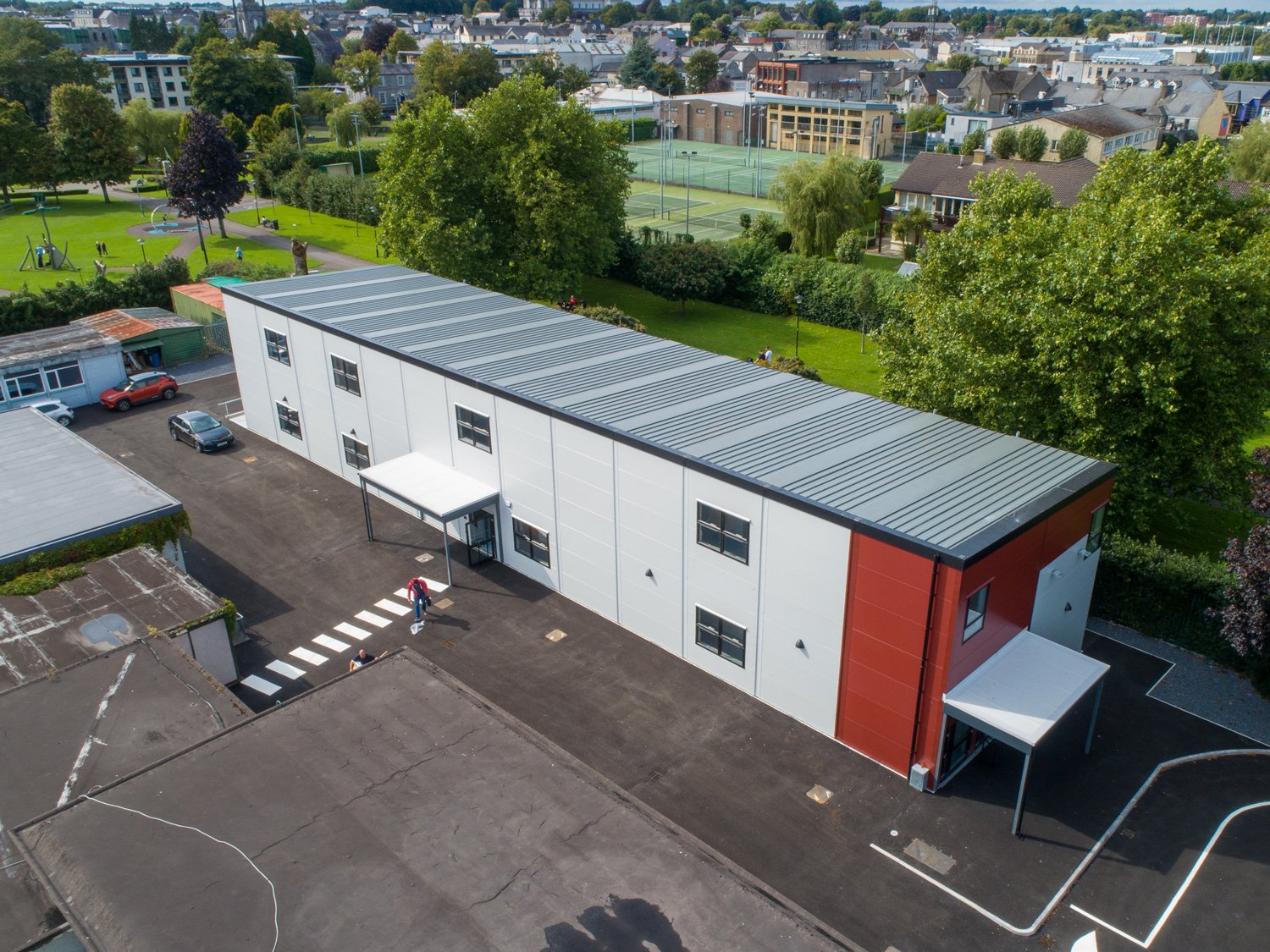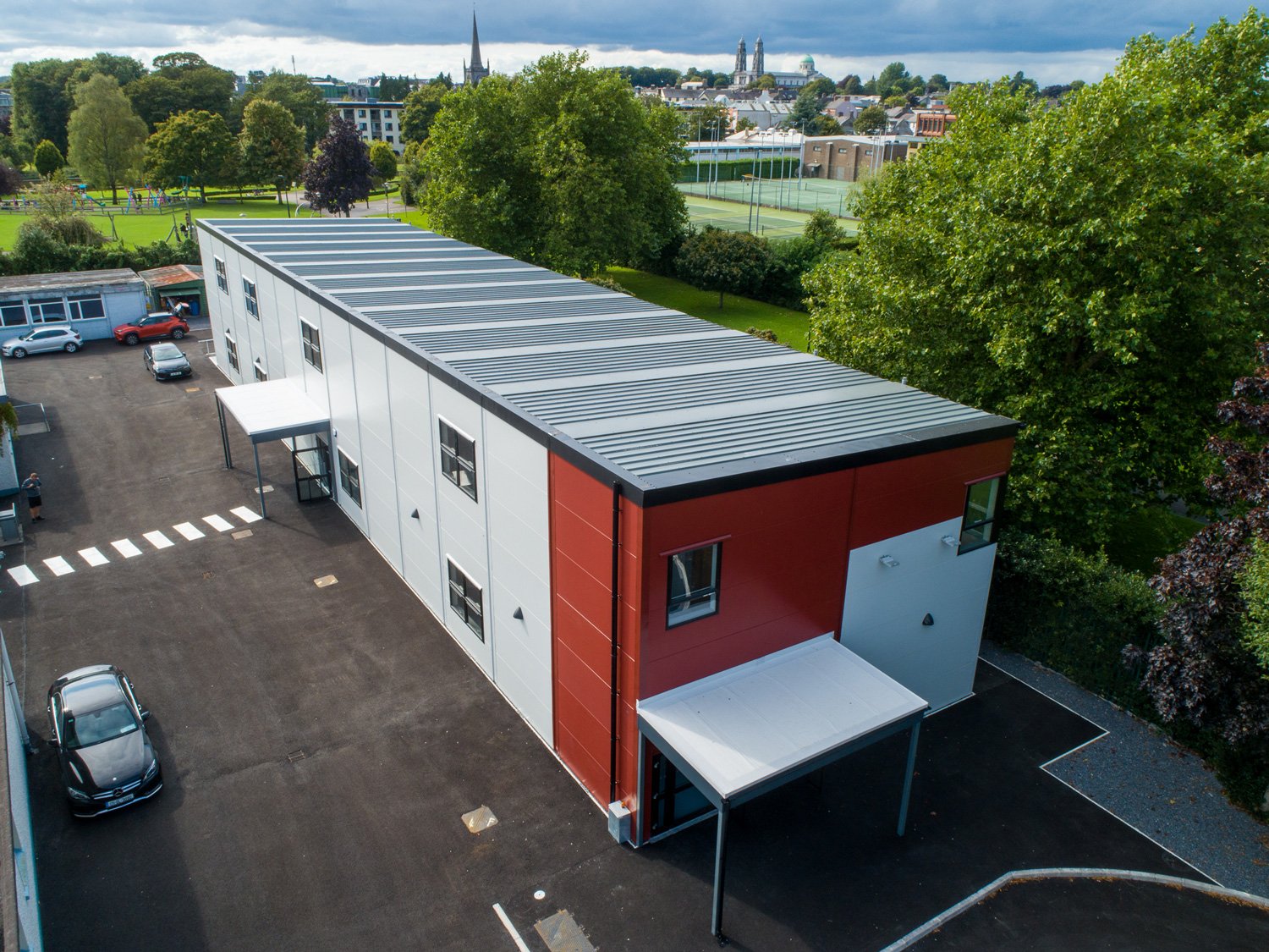 The building was installed to provide level-access for ease of access and avoiding ramps and steps. Canopies were also installed to provide cover at the entrances.